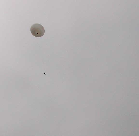 "Away she goes!" Launched weather balloon rising into the sky with radio transmitter attached.