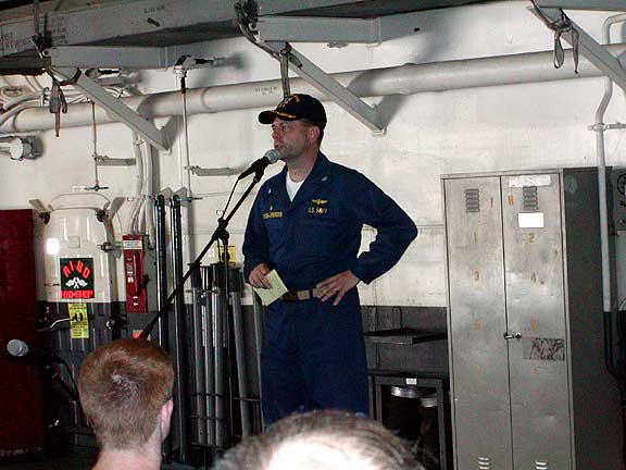 The Commanding Officer (CO) of LHD-6, Capt. Jon F. Berg-Johnson, giving his "Welcome Aboard" speech to Tigers gathered in the ship's hanger bay.
