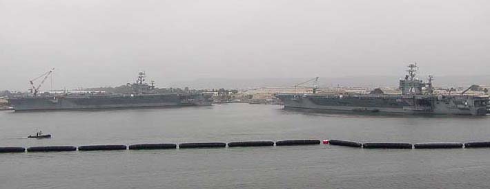 and USS John B. Stennis (CVN-74) docked at North Island, San Diego, CA as LHD-6 was coming up (inbound) the San Diego Harbor channel. Photo by Bob Dollins © 9/15/2003 |