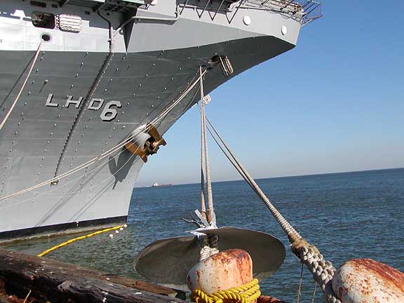 Closeup of starboard "golden" bow anchor, Pier 31, San Francisco, CA