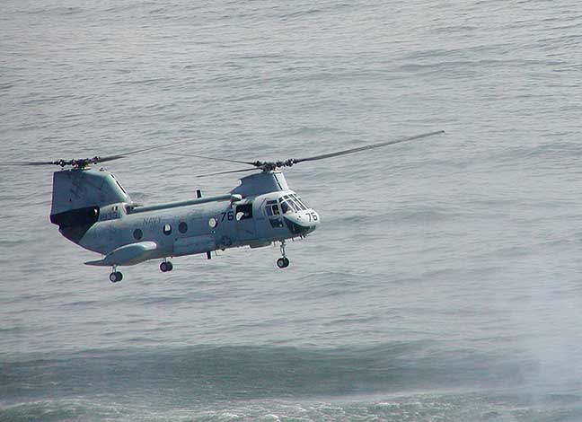 CH-46 "Sea Knight" simulating Search and Rescue (SAR) pickup of man in water.