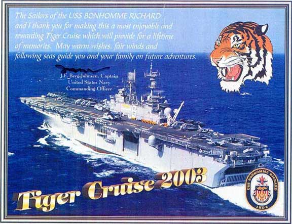 On September 12, 2003, it was my privilege to be one of the approximately 190 "Tigers" (civilian guests) invited aboard the USS Bonhomme Richard (LHD-6) for a 4 day "Tiger Cruise" from San Fancisco,